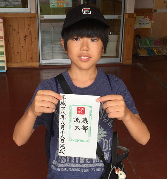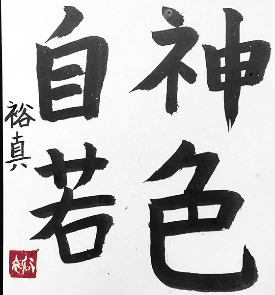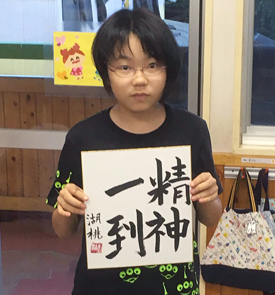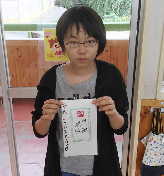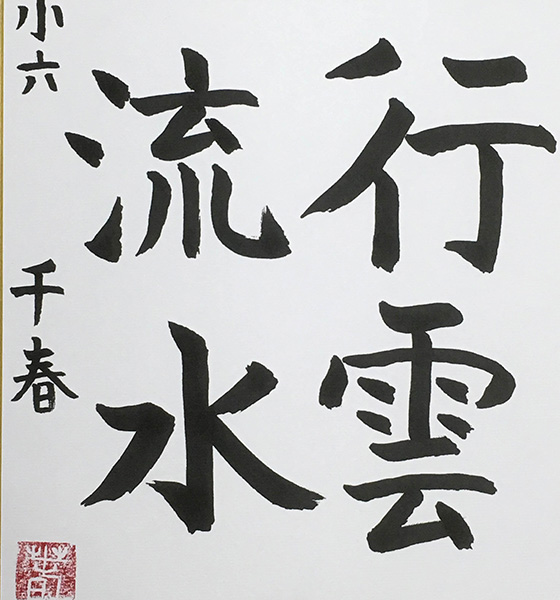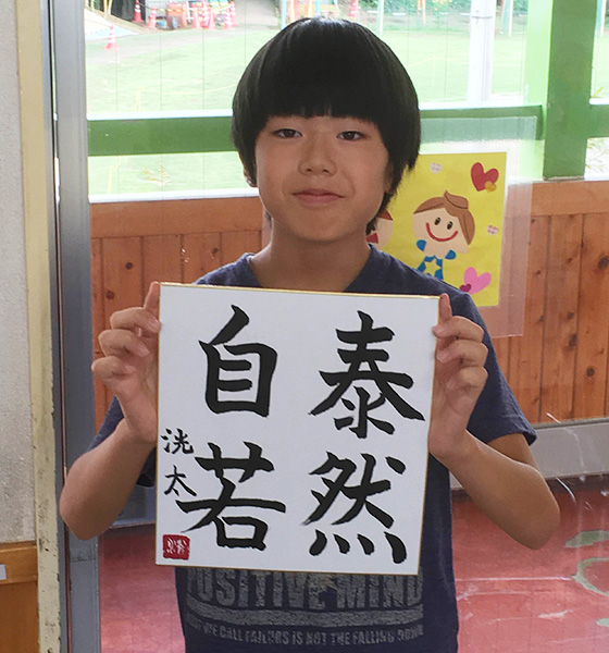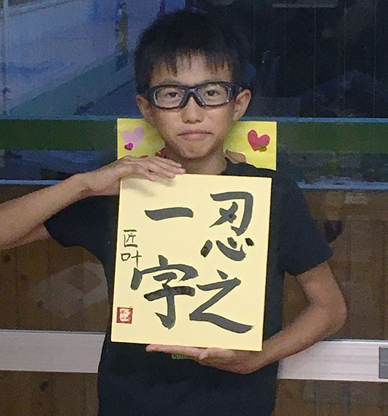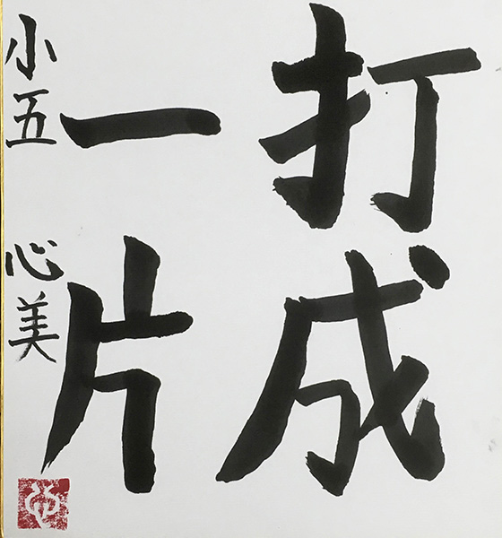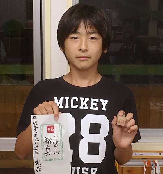 どうですか?彫っているときの真剣なまなざし!色紙に四文字熟語を書き、制作した印を押し完成。